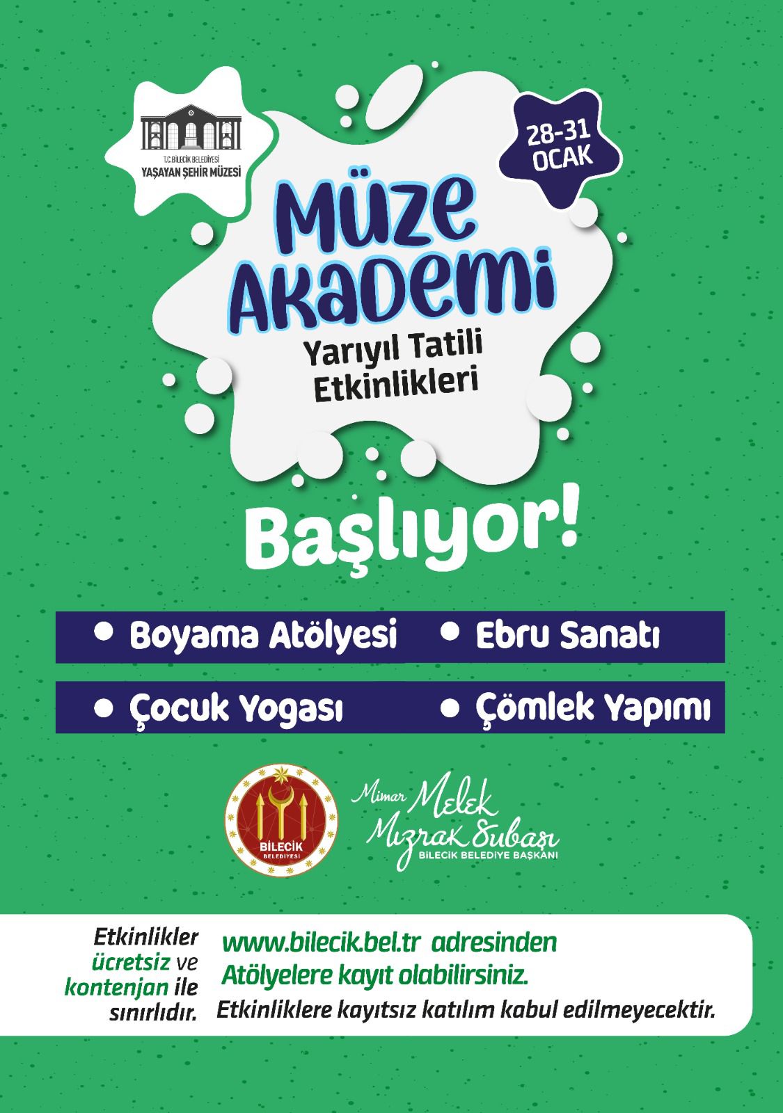 Belediye Başkanı Melek Mızrak Subaşı’nın çocuklara yarıyıl tatili olarak hazırlanan ücretsiz aktiviteler kontenjanlarla sınırlı olup kayıtlar, www.bilecik.bel.tr adresinden gerçekleştirilebilecektir.